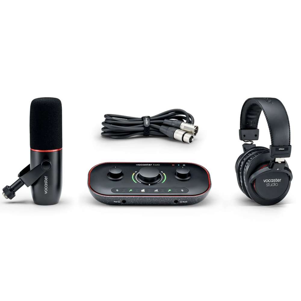 The Focusrite Vocaster Two Studio is a complete podcasting solution that includes everything you need to record high-quality audio. It features two high-quality mic preamps, auto gain, enhance, Bluetooth phone connectivity, headphone outputs, loopback, and USB-C connectivity. It also comes with a Focusrite DM14v podcast microphone, HP60v headphones, and a mic cable.