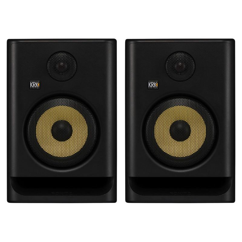 The KRK Rokit 7 G5 is a 7-inch powered studio monitor designed for both nearfield and midfield applications. It features a 7″ woven Kevlar aramid fiber woofer and a 1″ silk dome tweeter, delivering a frequency response of 45 Hz – 36 kHz.