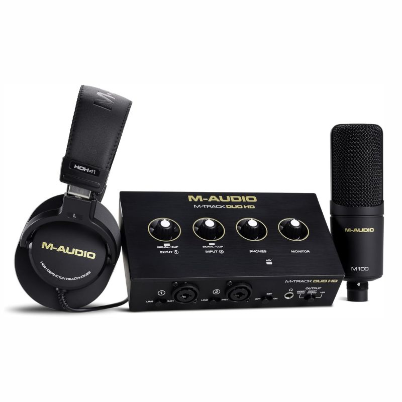 The “Producer Pack” is what differentiates this product from the standalone M-Track Duo HD interface. The bundle typically includes: