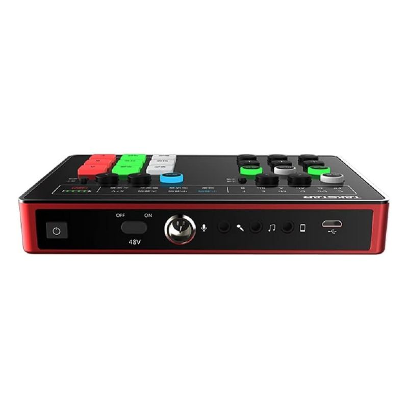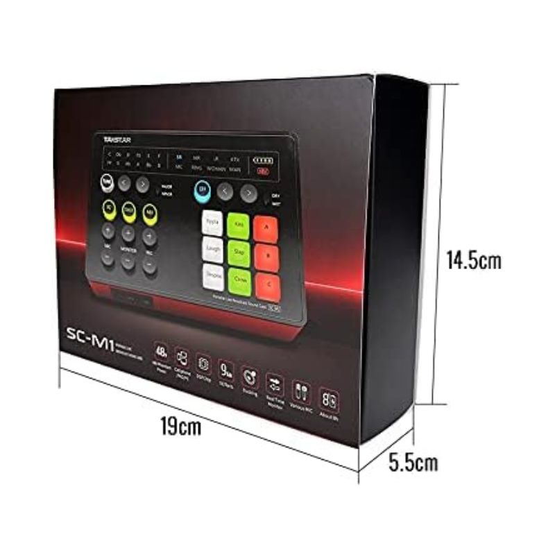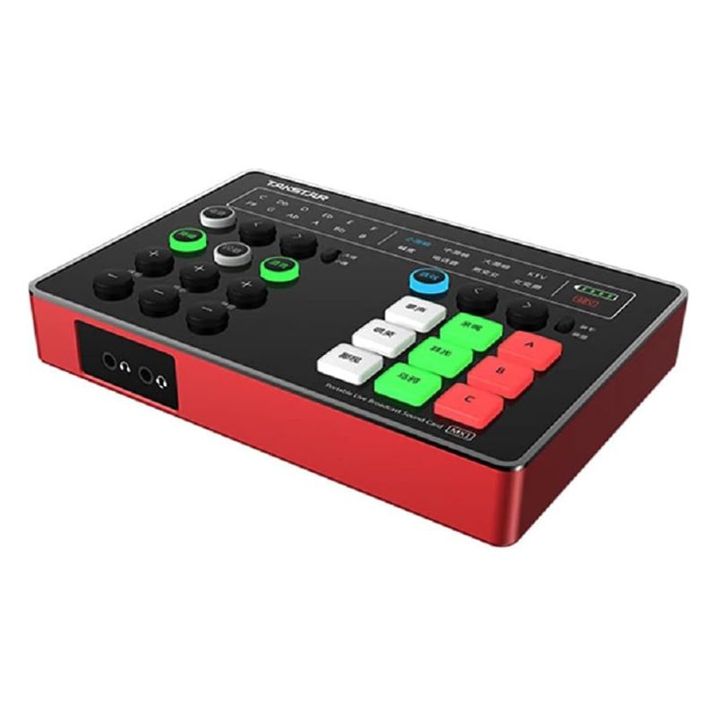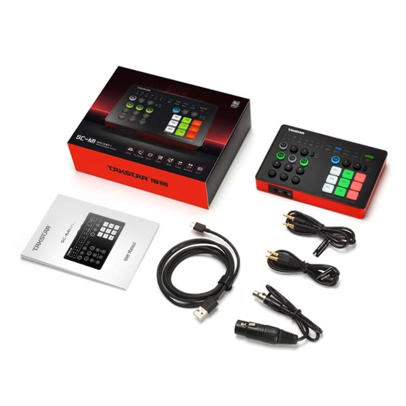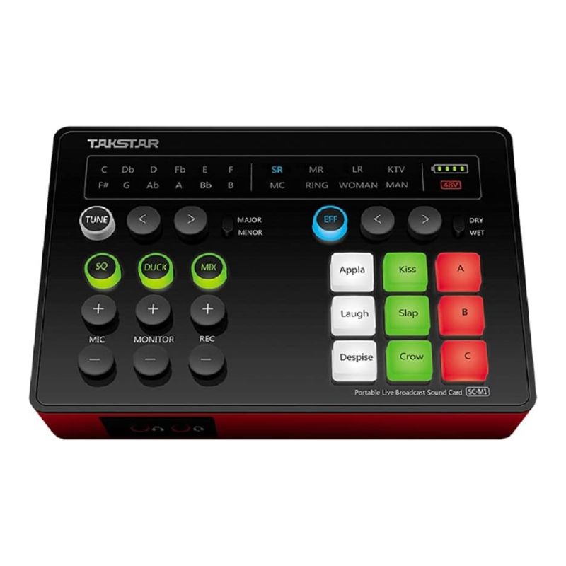 The Takstar SC-M1 is a compact, pocket-sized live broadcast sound card designed for mobile and PC-based streaming, karaoke, and podcasting. It is particularly popular because it packs professional features like 48V phantom power and a dedicated DSP processor into a battery-powered device roughly the size of a smartphone.