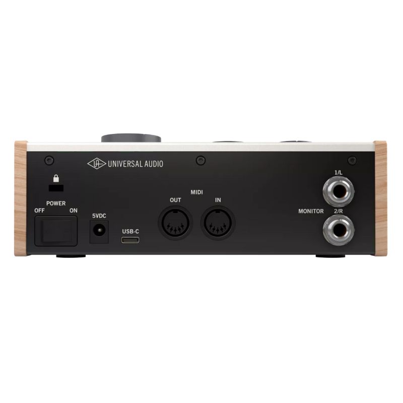 • Two combo XLR/TRS (mic/line/Hi‑Z) inputs, two balanced monitor outs, headphone out, plus 5‑pin DIN MIDI in & out. Useful for small studio setups, guitarists, synths, etc.