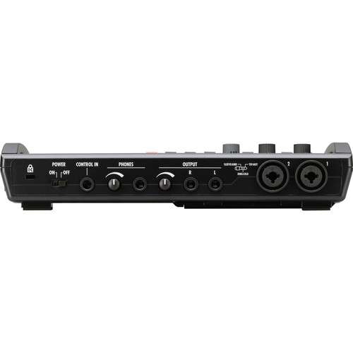• XLR/TRS combo inputs let you connect external microphones and instruments. The R8 also has a stereo 1/4″ output for connecting external speakers, plus a 1/4″ headphone jack for private monitoring. A 1/4″ control input supports wired remote control