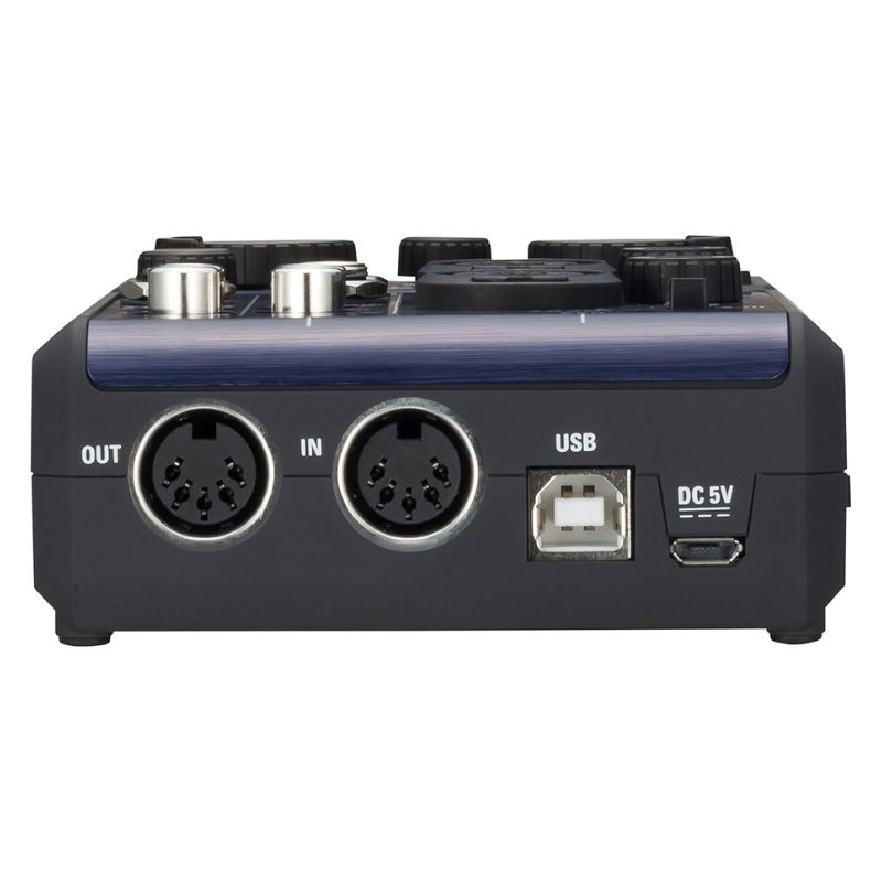 Zoom U 44 Handy 4 Audio Interface features two TRS/XLR combo jacks for inputs, in/out S/PDIF Optical Toslink and S/PDIF Coaxial on RCA, MIDI In/Out, two TRS 1/4″ unbalanced jack outputs, RCA line-level outputs and a standard stereo headphone jack.